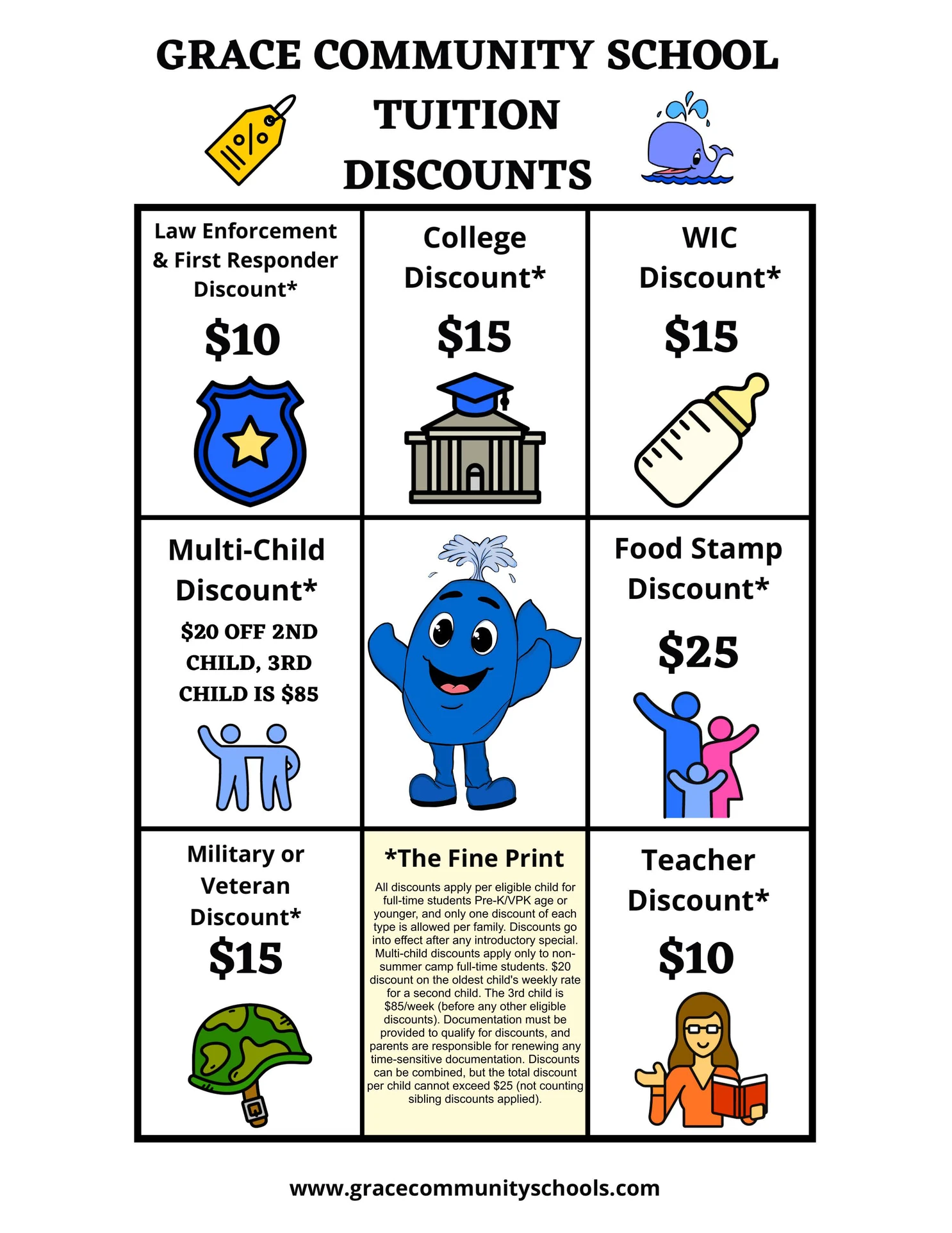 Grace Community School is proud to support families who contribute to our community in a variety of ways. We offer discounts for law enforcement, first responders, college students, Medicaid and WIC recipients, military personnel, veterans, and teachers. There are also discounts for families with multiple children. If you fall into one of these categories, you may be eligible for substantial savings on your child's tuition.