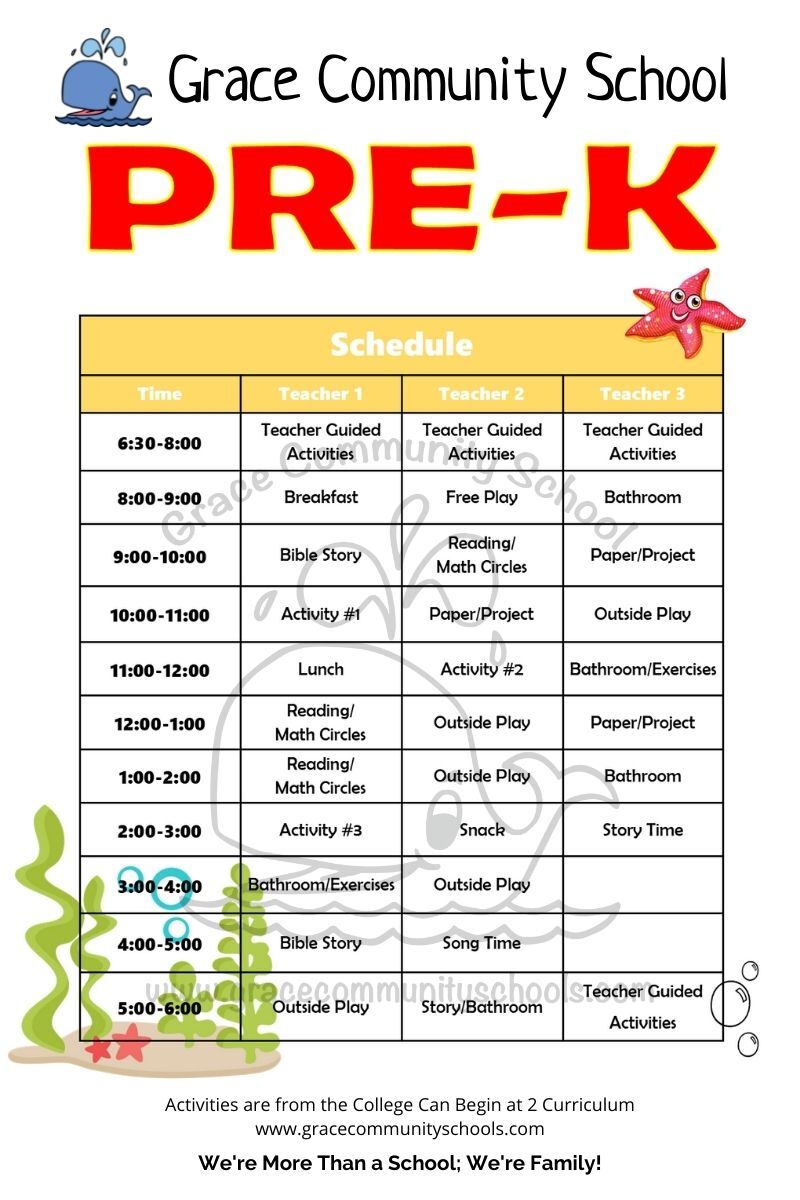 At Grace Community School we actually have two classrooms for four-year-olds. Here is the schedule for four-year-old students before their Pre-K year. Get more info about Grace Community School’s four-year-old program here.