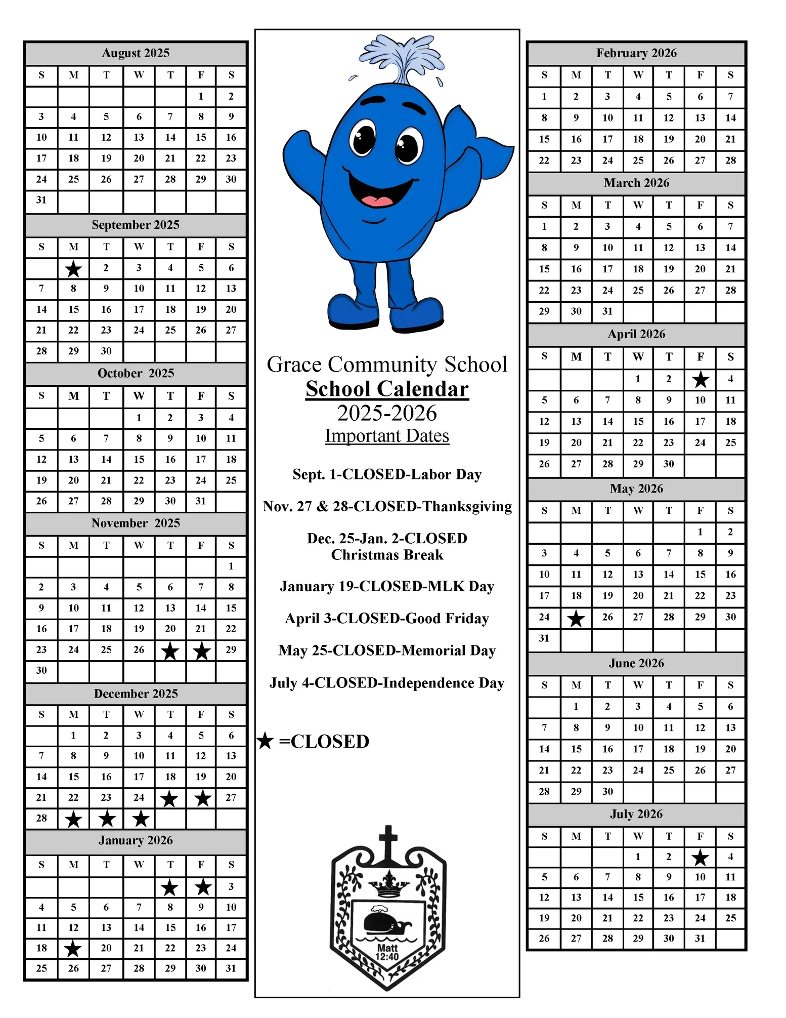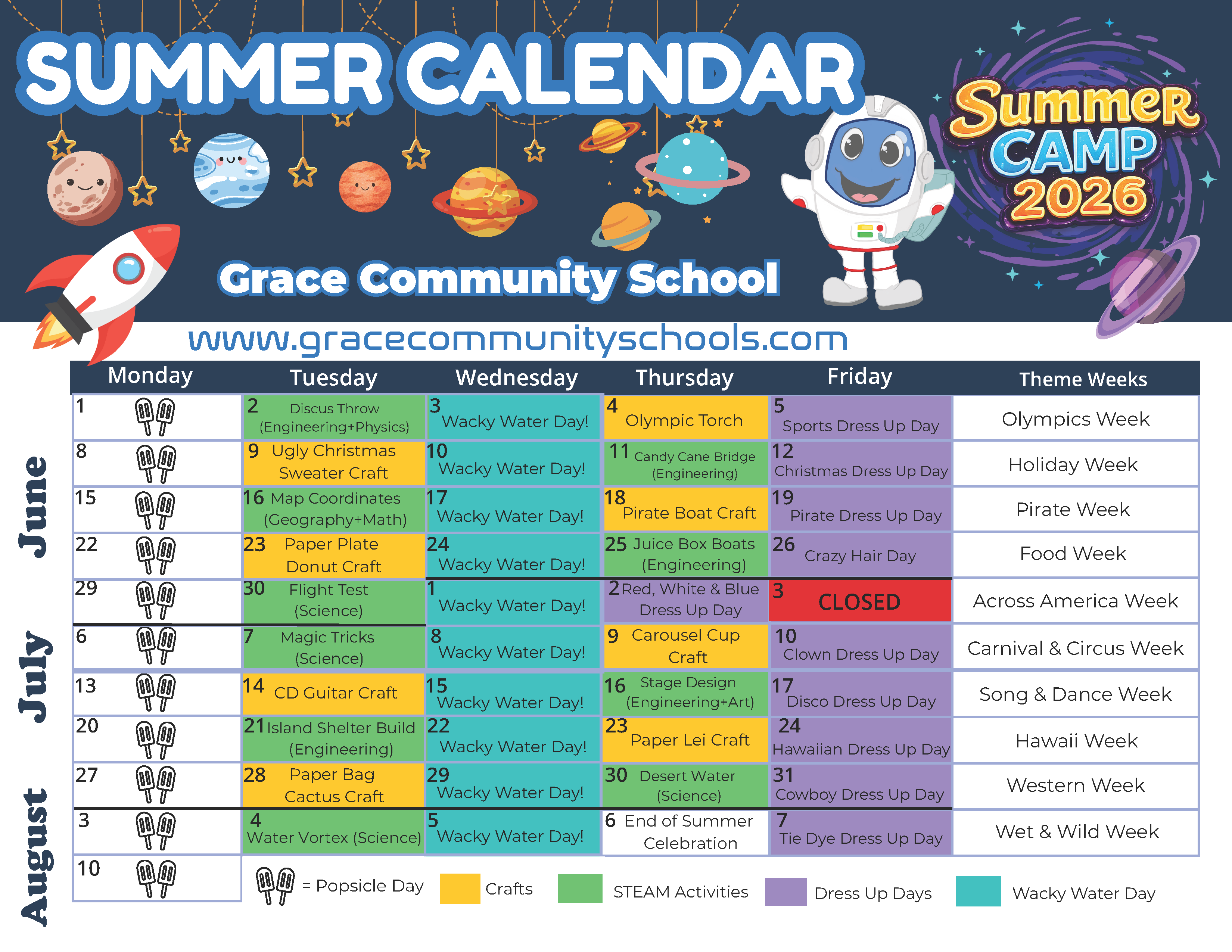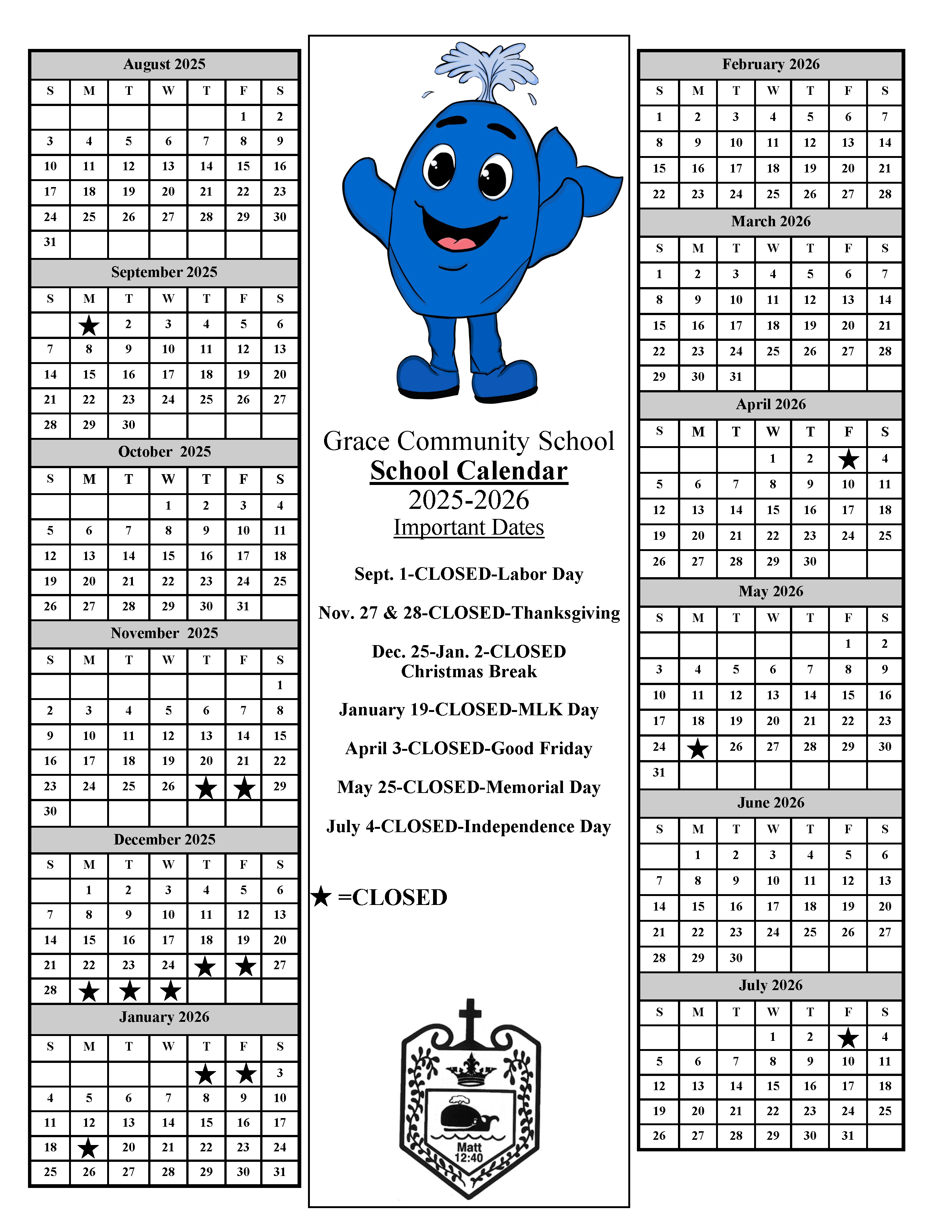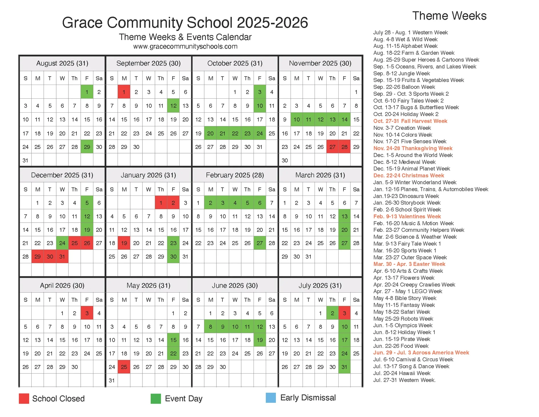 A lot is going on at Grace Community School! Our daycare and school curriculum keep everything fun with theme weeks, student participation days, and parties. With our online school calendar, you’ll always know what’s coming up. We’re not closed for many days out of the year, but you’ll find any days off also indicated.